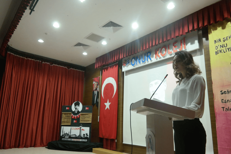 Onur Koleji Batıkent Kampüsü 13 Ekim Ankara’nın Başkent Oluşu’nun 95. Yıldönümünü Kutluyor. Cumhuriyet tarihimiz için büyük bir öneme sahip olan Ankara’nın, başkent ilan edilmesi yapılan oratoryo, okunan şiir ve Ankara’nın geçmişten günümüze İngilizce tanıtımı ile büyük bir coşku içinde kutlandı. Kızılca kıyametin koptuğu gün Ankara’ya gelen ülkemizin kurtarıcısı Ulu Önder Mustafa Kemal Atatürk’ü coşku ile karşılayan ve her durumda “Yanınızdayız Atam!” diyen Ankara’nın yiğit seymenlerinin torunları “Ankara Kulübü Derneği Seymenler Ekibi” Onur Ailesi ile buluştu. Gösterilerinin ardından Genel Müdürümüz Sayın Yahya KIRAÇ Onur Ailesi ve öğrencileri olarak okulumuzda bu kültürü yaşatmak için gösterilerini sunan seymenlerimize çok teşekkür ederiz, diyerek hediyelerini takdim etti. Biz de Onur Koleji olarak Ankara Kulübü Derneği Seymenler Ekibine teşekkürlerimizi sunuyoruz.